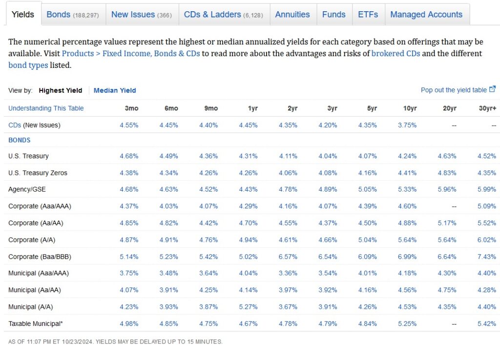 My $3,000 purchase was an experiment to test this concept and “put some skin in the game.” Interestingly, after the Fed’s rate cut, the 3-month T-Bill yield dropped almost immediately, but the 10-, 20-, and 30-year bond yields actually went up. When I made my purchase, the 20-year bond yield was 4.09%; now, less than a month later, it has risen to 4.63% as of today (10/23/2024). This means the value of my bond has already dropped by roughly 10%. But why?